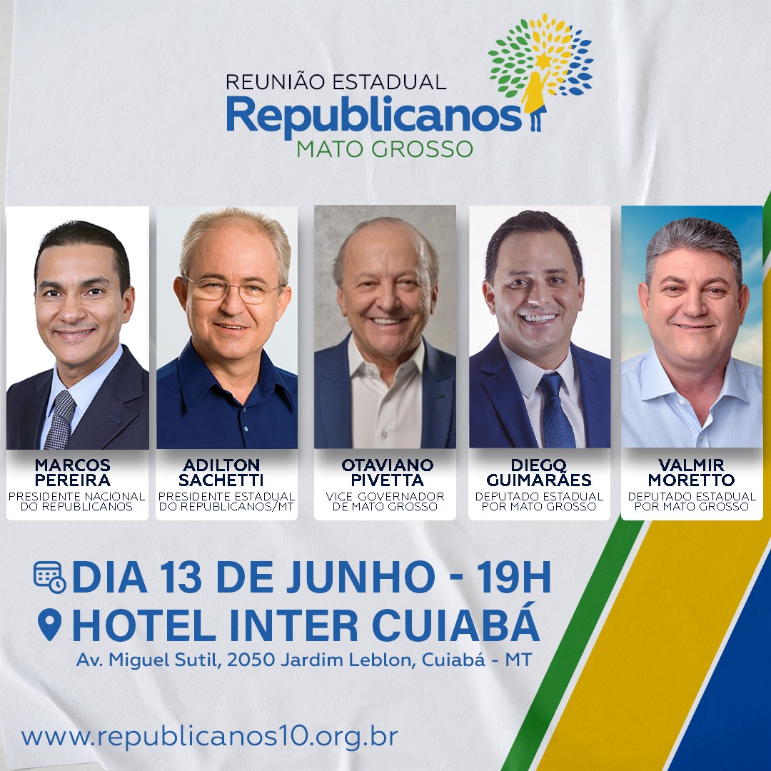 O presidente nacional do Republicanos, deputado federal Marcos Pereira, vem a Cuiabá nesta quinta-feira (13.06) para participar da reunião estadual do partido. Além dele, são