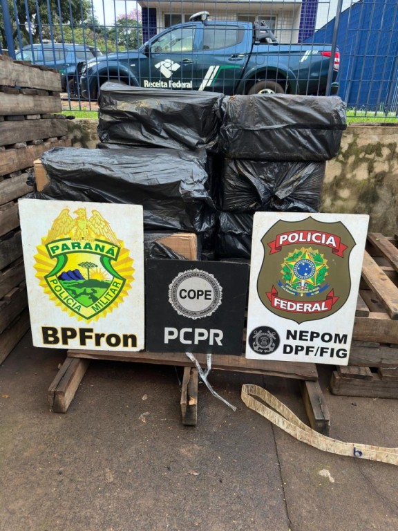 Foz do Iguaçu/PR. Policiais federais, civis e militares apreenderam 11 caixas de cigarros ao abandono, durante patrulhamento na região marginal do rio Paraná.