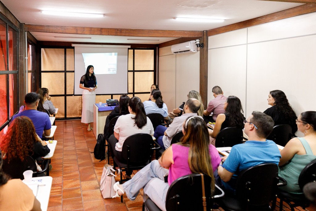 A foto mostra uma sala da Controladoria Geral do Município de Cuiabá onde acontece a primeira reunião do Comitê de Transparência. No local estão reunidas diversos servidores representando suas respectivas secretarias e órgãos da administração municipal. A diretora Érika está posicionada em pé, liderando a explanação do conteúdo e os participantes estão sentados.