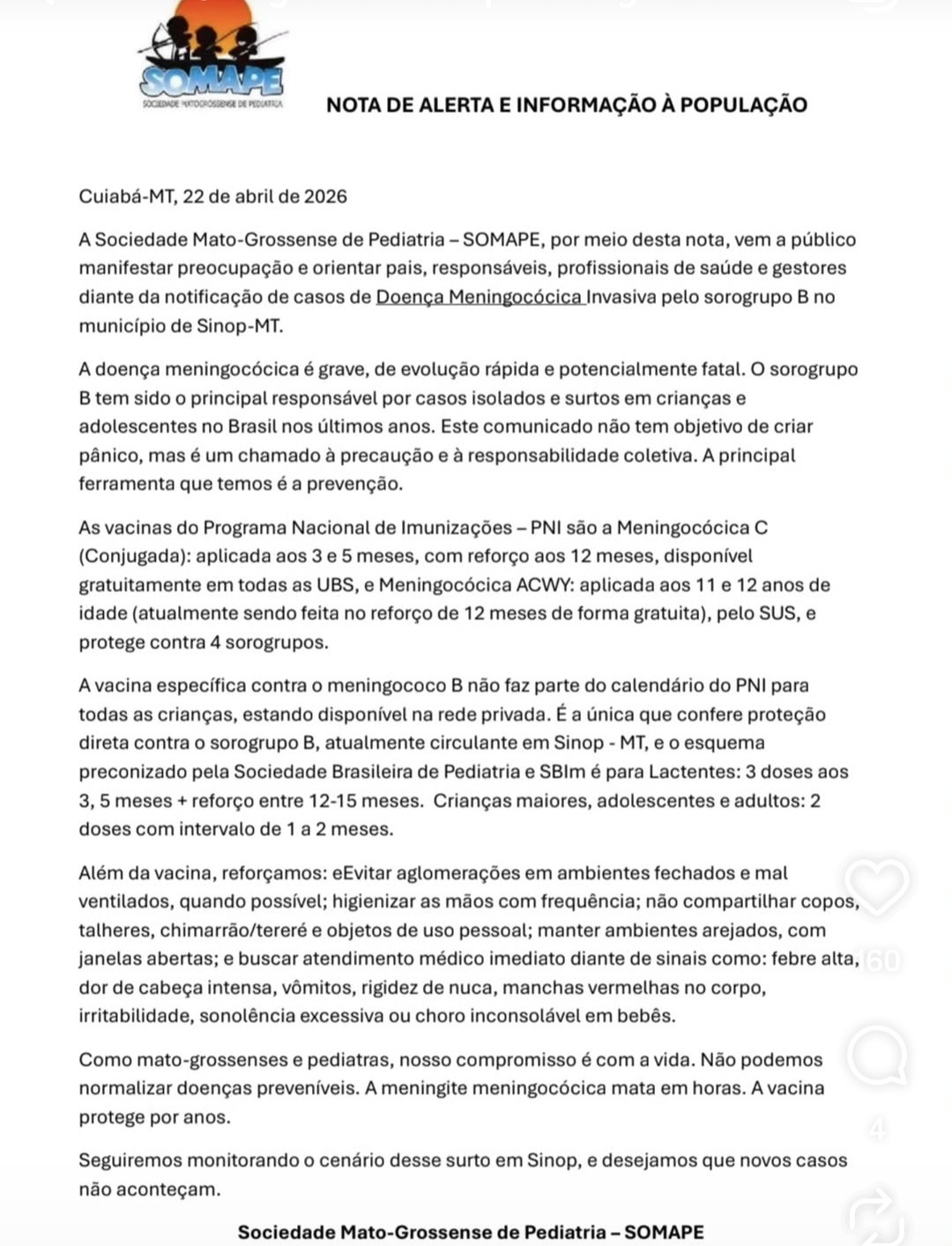 No mesmo dia 22 de abril, a Sociedade Mato-grossense de Pediatria emitiu uma nota oficial confirmando a circulação da Doença Meningocócica Invasiva pelo sorogrupo B no município.