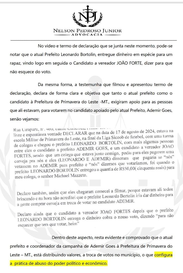 Com o vídeo e as declarações anexadas ao processo, espera-se que a Justiça Eleitoral e o Ministério Público atuem com rigor na investigação das irregularidades e, caso comprovadas, punam os responsáveis. Se as acusações forem confirmadas, Léo Bortolin e seus aliados poderão enfrentar sérias consequências, incluindo a cassação de suas candidaturas e a perda de direitos políticos, ameaçando a integridade do processo eleitoral em Primavera do Leste.